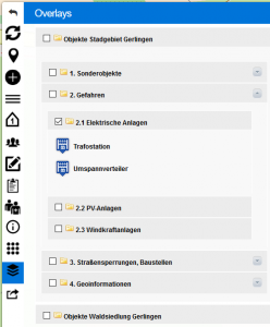 Overlays Eigene Overlays Je nach Tarif können bis zu 20 eigene Overlays angelegt werden, welche die Lagekarte um zusätzliche Informationen erweitert. Ordnerstruktur Für eine übersichtlichere Strukturierung können Ordner und Unterordner angelegt werden, unter denen die einzelnen Objekte aufgeführt werden. Zeichnungen Mit den Zeichenfunktionen können Linien, Polygone, Rechtecke, Kreise und Marker innerhalb der Overlays erstellt und bearbeitet werden. Objektinformationen Für Objekte können zusätzliche Informationen hinterlegt werden (Anfahrtsbeschreibungen, ...). Datei-Upload Zudem können eigene Dateien zu dem Objekt hochgeladen und gespeichert werden (Geschosspläne, Foto-Material, Laufkarten, ...) Integration in die Lagekarte Über das Overlay-Modul in der Sidebar können die angelegten Overlays auf der Lagekarte eingeblendet werden.